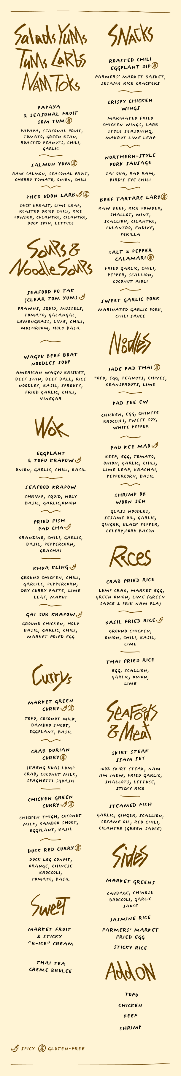 The Crab Durian Curry takes on a warmer, earthier feel, balanced by fall squash. Our Som Tum evolves too—papaya now mingling with seasonal fruits like apples or pears for crisp, unexpected brightness. Heartier dishes, like Wagyu Beef Boat Noodle Soup, become anchors of the menu, perfect for when you need a comfort soup.